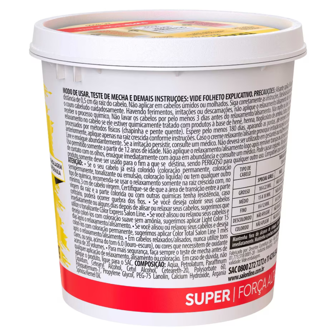 Atenção: Não aplique o relaxamento/alisamento logo após remover tranças ou alongamentos. Contém álcali. Se o seu cabelo já está colorido (coloração permanente, coloração semipermanente, tonalizante ou emulsão, coloração líquida) ou tem qualquer outro tipo de química, recomenda-se usar o relaxamento somente na raiz crescida com, no mínimo, 3 cm de cabelo virgem. Certifique-se de que a área de transição entre a parte virgem da raiz e a parte colorida ou com outras químicas tenha resistência, caso contrário, poderá ocorrer quebra dos fios.