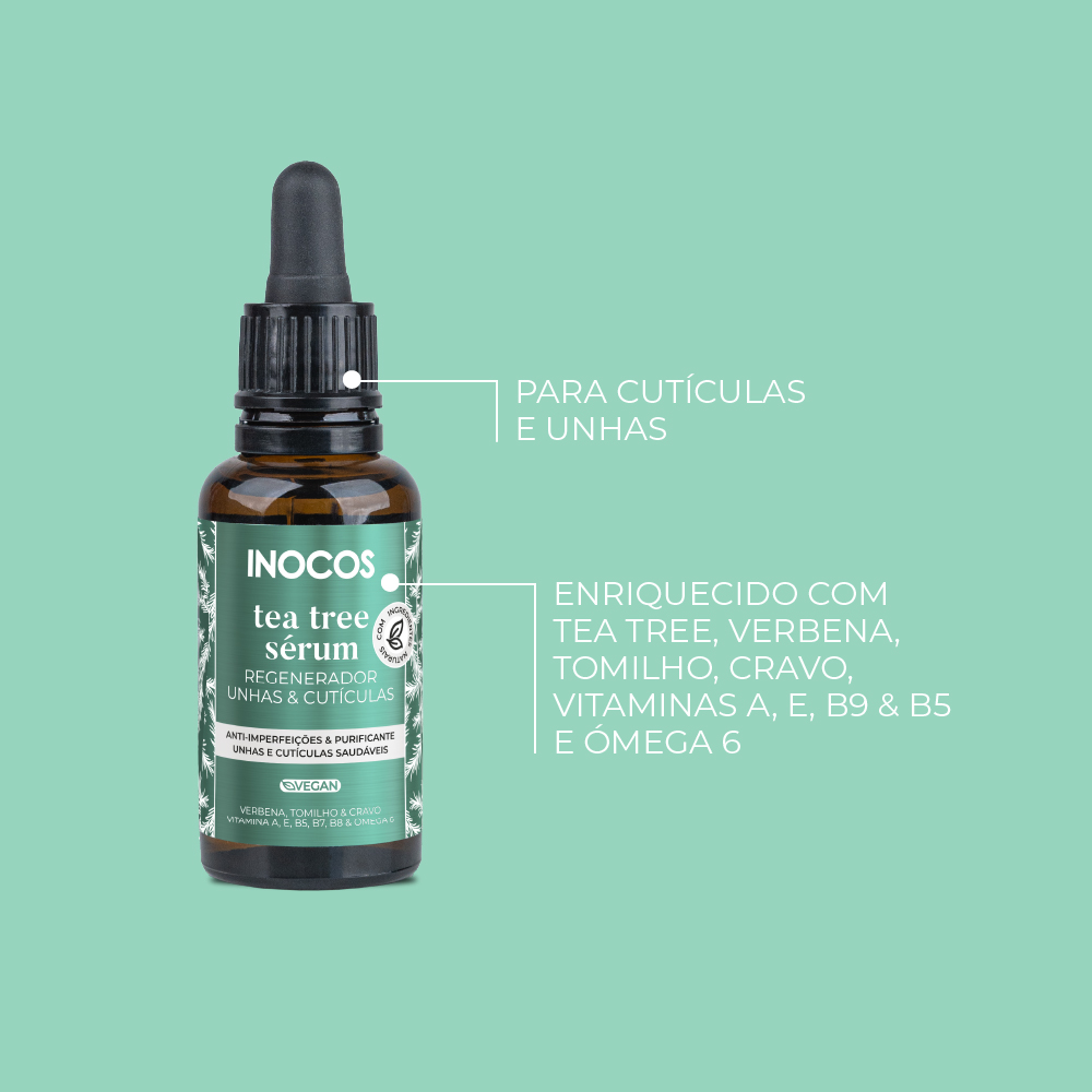 O INOCOS Tea Tree Serum é ideal para cutículas e unhas. Trata-se de um produto enriquecido com verbena, tomilho, cravo, vitaminas A | E | B9&B5 e ómega 6.