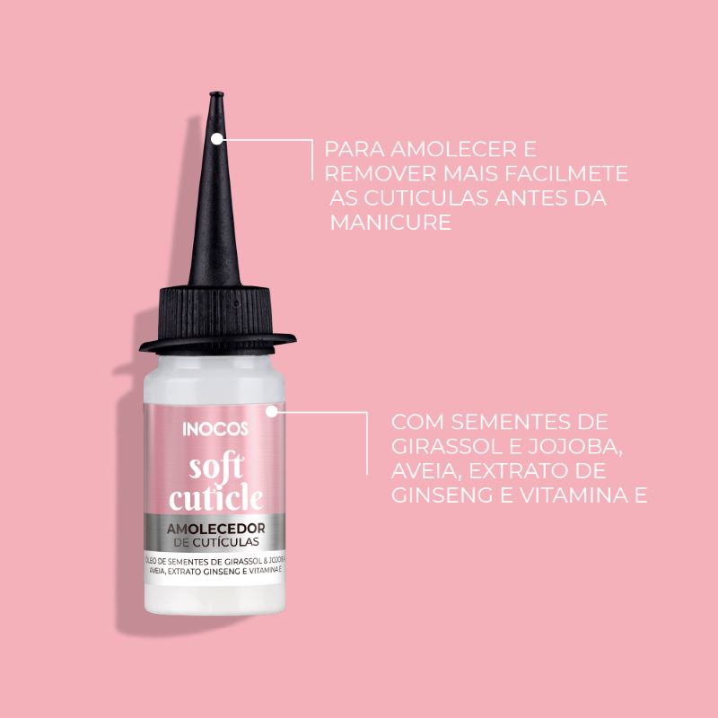 Soft Cuticle ideal para amolecer e remover mais facilmente as cutículas, antes da manicure. Enriquecido com óleo de sementes de girassol e jojoba, aveia, extrato de ginseng e vitamina E